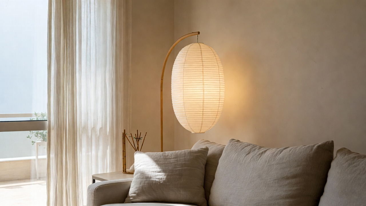 • ลักษณะโคมไฟ: ควรเลือกโคมไฟที่มีรูปทรงเรขาคณิตเรียบง่าย เช่น ทรงกลมหรือทรงกระบอก วัสดุควรเป็นไม้ไผ่ ผ้ากระดาษสา หรือโลหะพ่นสีขาว/ครีม