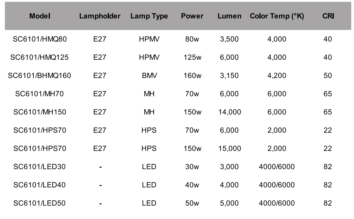 หลอดไฟที่รองรับ: HPMV (80W-125W), MH (70W-150W), HPS (70W-150W) หรือ LED (30W-50W)