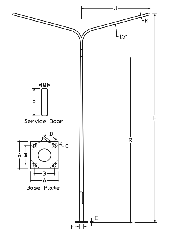 SC62/600-200: สูง (H) 6.0 m | โคนเสา (F) 127 mm | ระยะยื่น (J) 2000 mm