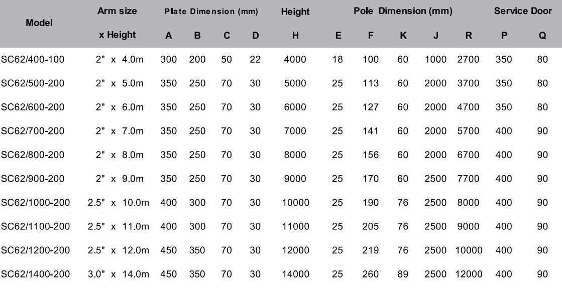 SC62/800-200: สูง (H) 8.0 m | โคนเสา (F) 156 mm | ระยะยื่น (J) 2000 mm | ปลายกิ่ง 2.0"