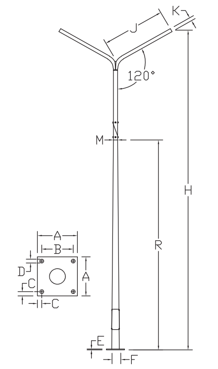 SC52T/600-150: สูง (H) 6.0 m | ขนาดโคน (F) 127 mm | ปลายกิ่ง (M) 60 mm | ระยะยื่น (J) 1500 mm