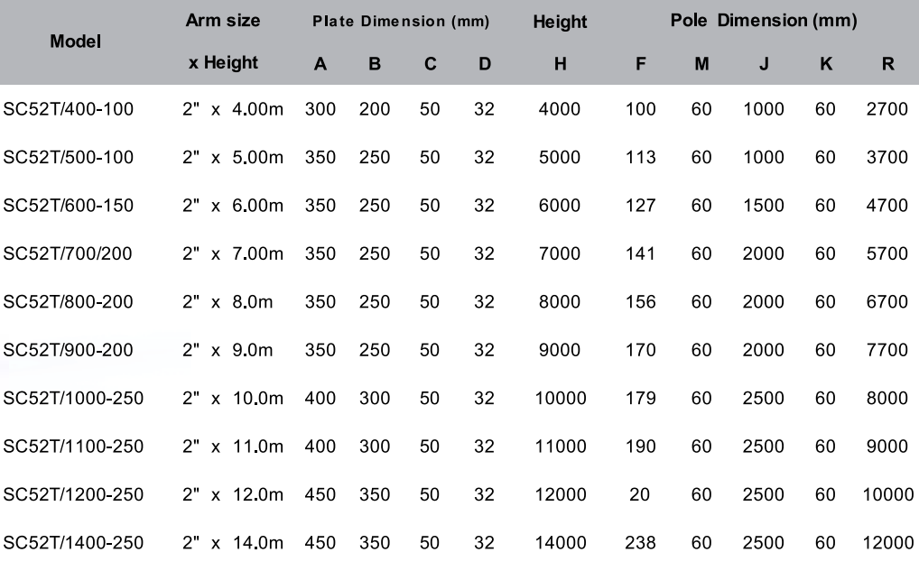 SC52T/900-200: สูง (H) 9.0 m | ขนาดโคน (F) 170 mm | ปลายกิ่ง (M) 60 mm | ระยะยื่น (J) 2000 mm