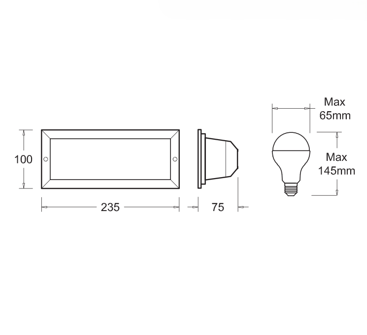 • ขนาดตัวโคม: ความยาว 235 mm, ความสูง 100 mm, ความลึก 75 mm