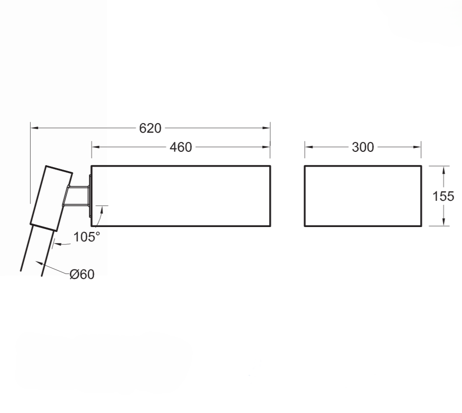ขนาดตัวโคม: ความยาว (L) 460 mm, ความกว้าง (W) 300 mm, ความสูง (H) 155 mm