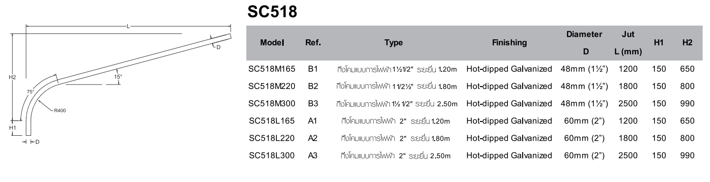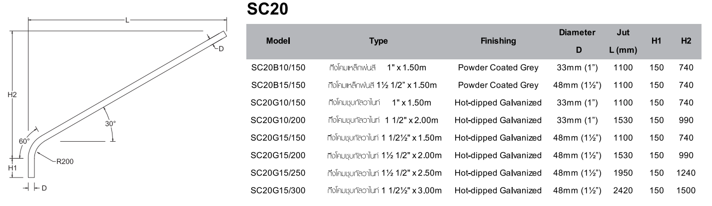 กิ่งโคมไฟถนนเดี่ยว (Single Bracket Arm) รุ่น SC20 - SC518