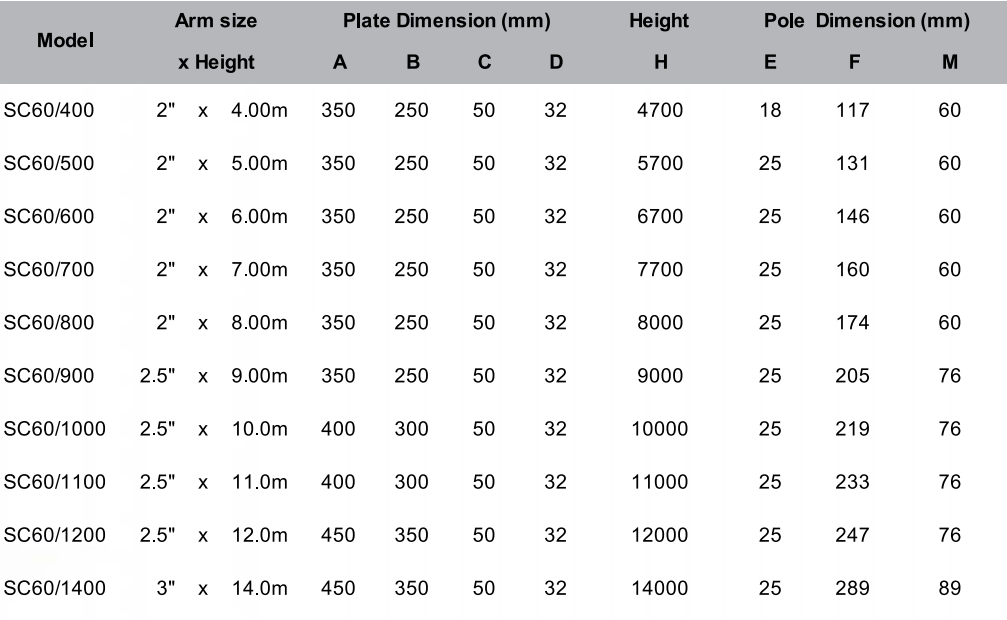 SC60/800: สูง (H) 8.0 m | ขนาดโคน (F) 174 mm | ปลายกิ่ง (M) 60 mm