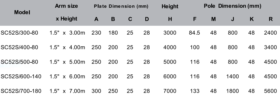 SC52S/600-140: ขนาดกิ่ง 1.5" x 6.0m | ความสูงเสา (H) 6.00 เมตร | ระยะยื่น (J) 1400 mm