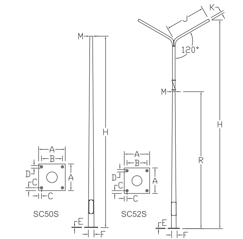 เป็นเสาตรงดีไซน์เรียบหรู และรุ่น SC52S (Double-Branch Tapered Pole) เป็นเสากิ่งคู่ที่ช่วยให้กระจายแสงสว่างได้สองทิศทาง