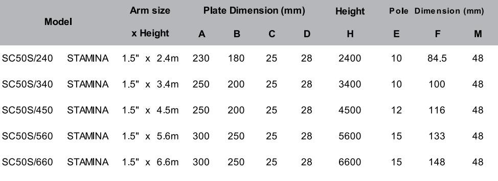 SC50S/450: ขนาดกิ่ง 1.5" x 4.5m | ความสูงเสา (H) 4.50 เมตร | ขนาดโคนเสา (F) 116 mm
